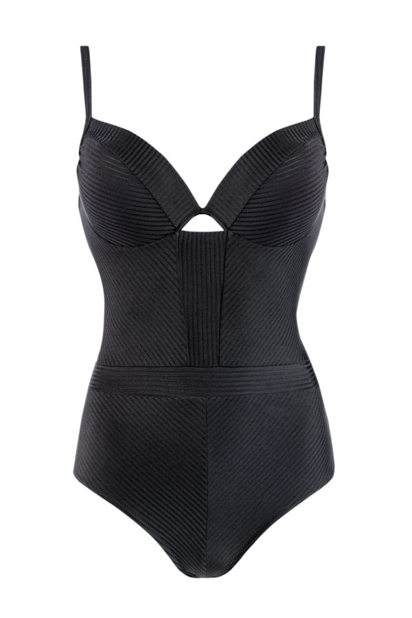 This swimsuit is not just another boring swimsuit. The black color combined with delicate stripes and a decorative cut at the line make it one of the most elegant on the market.